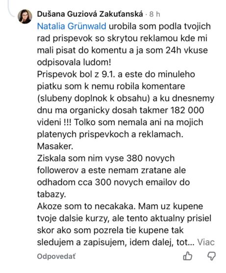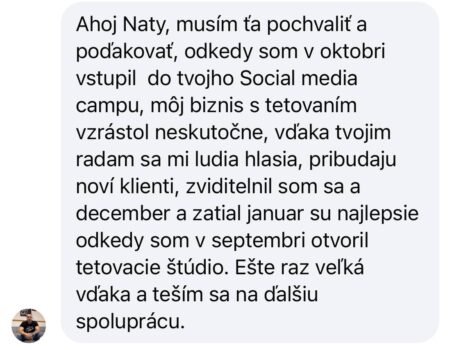 Som rada, že som v Tvojom mentoringu, lebo vďaka mindsetu a informáciám, ktoré som získala, som konečne pochopila ako na to. Vďaka Tebe som si pospájala mozaiku a vytvorila High Ticket - prémiový produkt, ktorého som sa tak obávala. Vytvorila som a za jeden víkend sa okamžite predával. Stále si mi vravela, vytvor si prémiový High Ticket a ja zasa v hlave.. ako, komu? Ale tou stratégiou, ktorou som prešla, mi to zrazu zaklaplo a jasne som vedela AKO to vytvoriť. Normálne zemetrasenie v hlave a hneď som robila jasné kroky a vytvorila som to. High Ticket je kvalitný obsah a priťahuje klientov, ktorí hľadajú hodnotu v ucelených programoch. Ďakujem, že som Ťa spoznala a môžem aj vďaka Tebe pomáhať druhým a tiež sama napredovať i v biznise.❤️